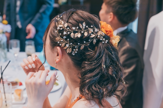 また、ショートヘアは耳周りがすっきりと見えるため、アクセサリーが映えるのもうれしいポイント。生花を使ったイヤーカフやヘッドドレスなど、結婚式ならではのアクセサリーを楽しんでみてはいかがでしょうか。