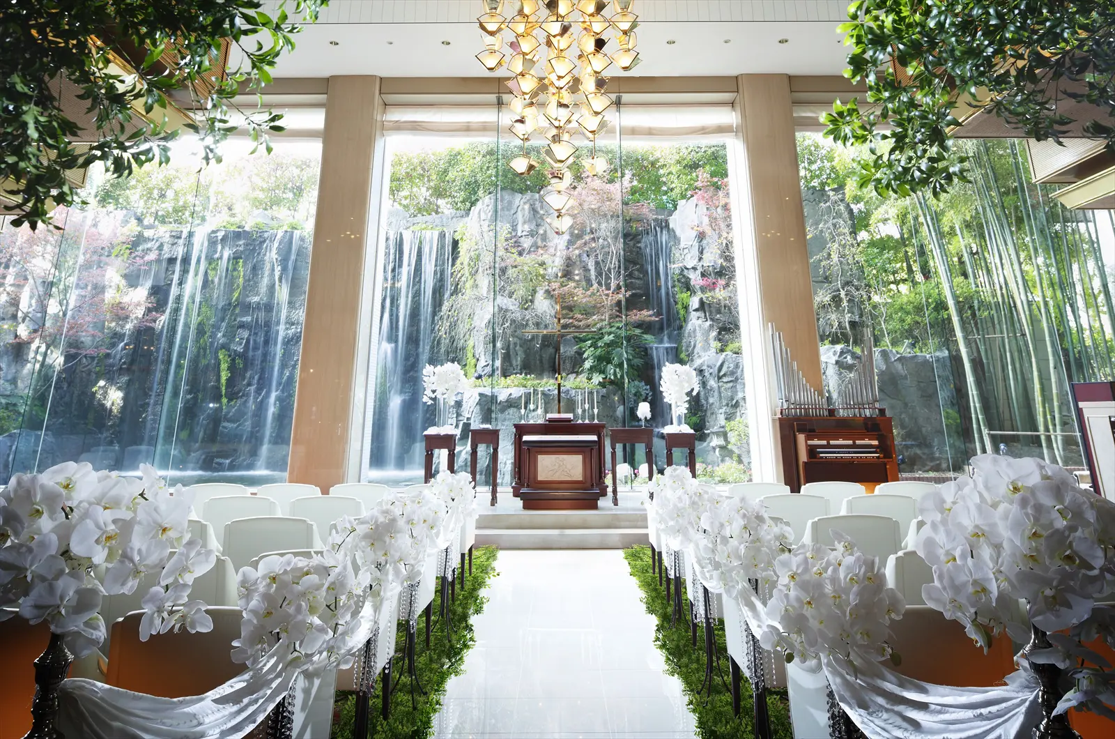 二条城前駅より徒歩1分。世界遺産の二条城のほとり建つ「ANAクラウンプラザホテル京都」でのウェディングはファーストクラスのような特別感に満ち溢れた1日。淡いキャンドルの灯に包まれたチャペルやダイナミックな滝を目の前にしたチャペルでのセレモニーは、ふたりとゲストの心に深く刻まれて。挙式後は、大きさや個性の異なる5つのバンケットで理想のウェディングパーティを。なかでも「醍醐の間」では調理風景が演出のひとつになるオープンキッチンを併設。ホテル自慢の料理の数々がパーティを華やかに彩る。