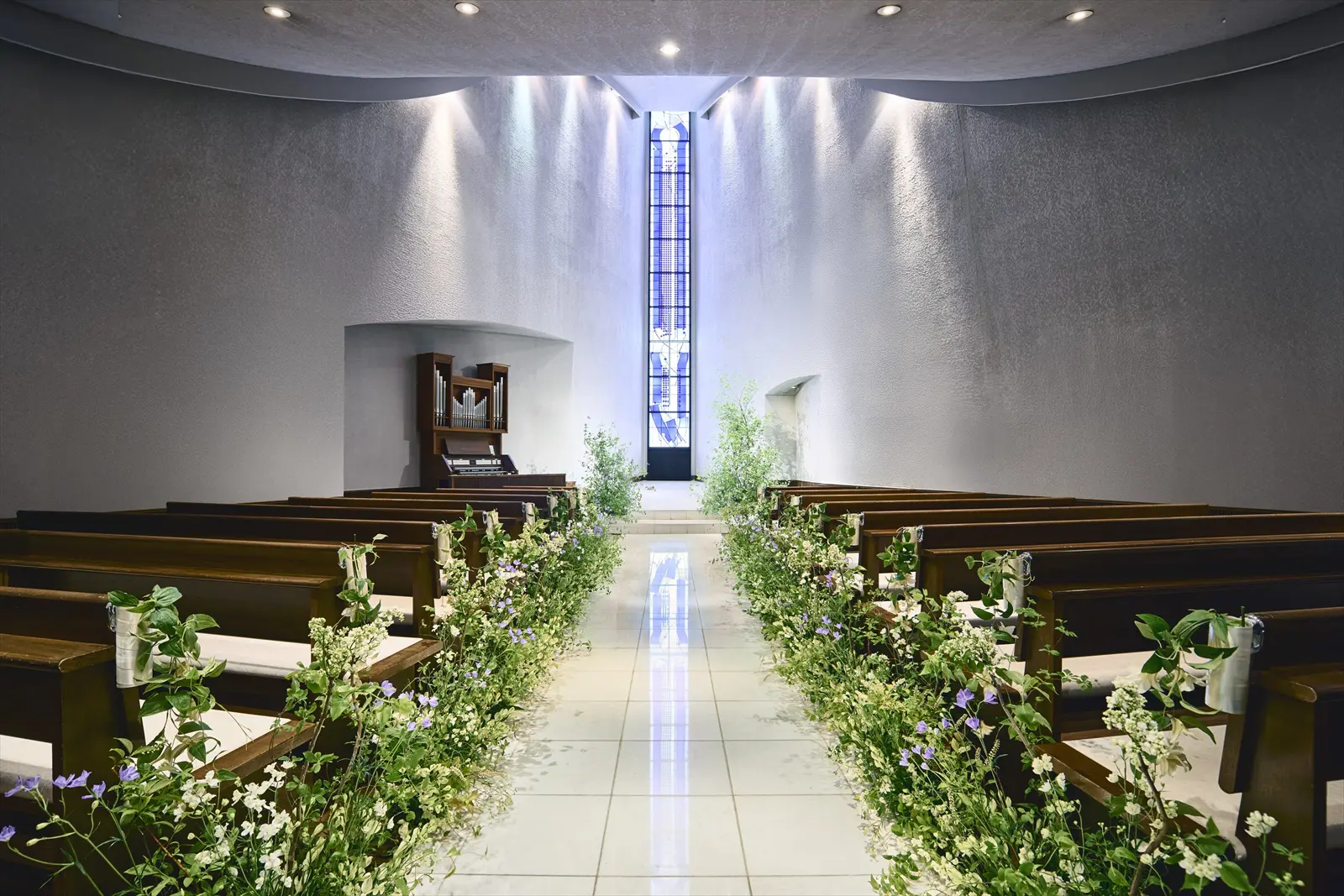 新神戸駅から直結で遠方ゲストにもうれしい好立地のホテル「ANAクラウンプラザホテル神戸」。六甲の雄大な自然や神戸の街並みやベイエリアを望むビューは圧巻。ゲストに神戸を感じてもらえるパーティが叶う。祭壇に近づくにつれて空間が広がる青いステンドグラスが印象的な白亜のチャペルで神聖なセレモニーを。