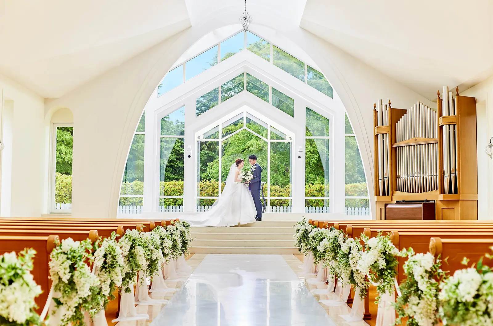 仙台駅より車で15分。青葉の森に囲まれた4300坪のフォレストウエディングリゾート「アートグレイス フォレスト迎賓館」。天井高11m、最大列席数170名というスケールを誇る「クリスタルチャペル」は、全面ガラス張りの祭壇越しに森が広がる開放的な空間。挙式後は太平洋まで一望できる大階段でフラワーシャワーを。パーティの舞台は3つの貸し切り邸宅、ブローニュ フォレスト邸、グリーンフォード テラス邸、ハンプトンガーデン邸で。専属のシェフが作る世界三大珍味を散りばめたモダンな和テイストのメニューでおもてなしが叶う。