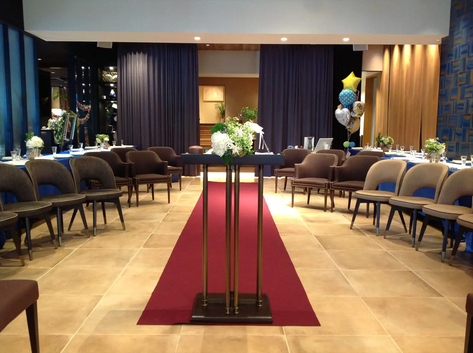 - 新郎新婦控室, 更衣室, 音響, マイク, DVD, CD, 照明, VTR, プロジェクター, スクリーン, クローク