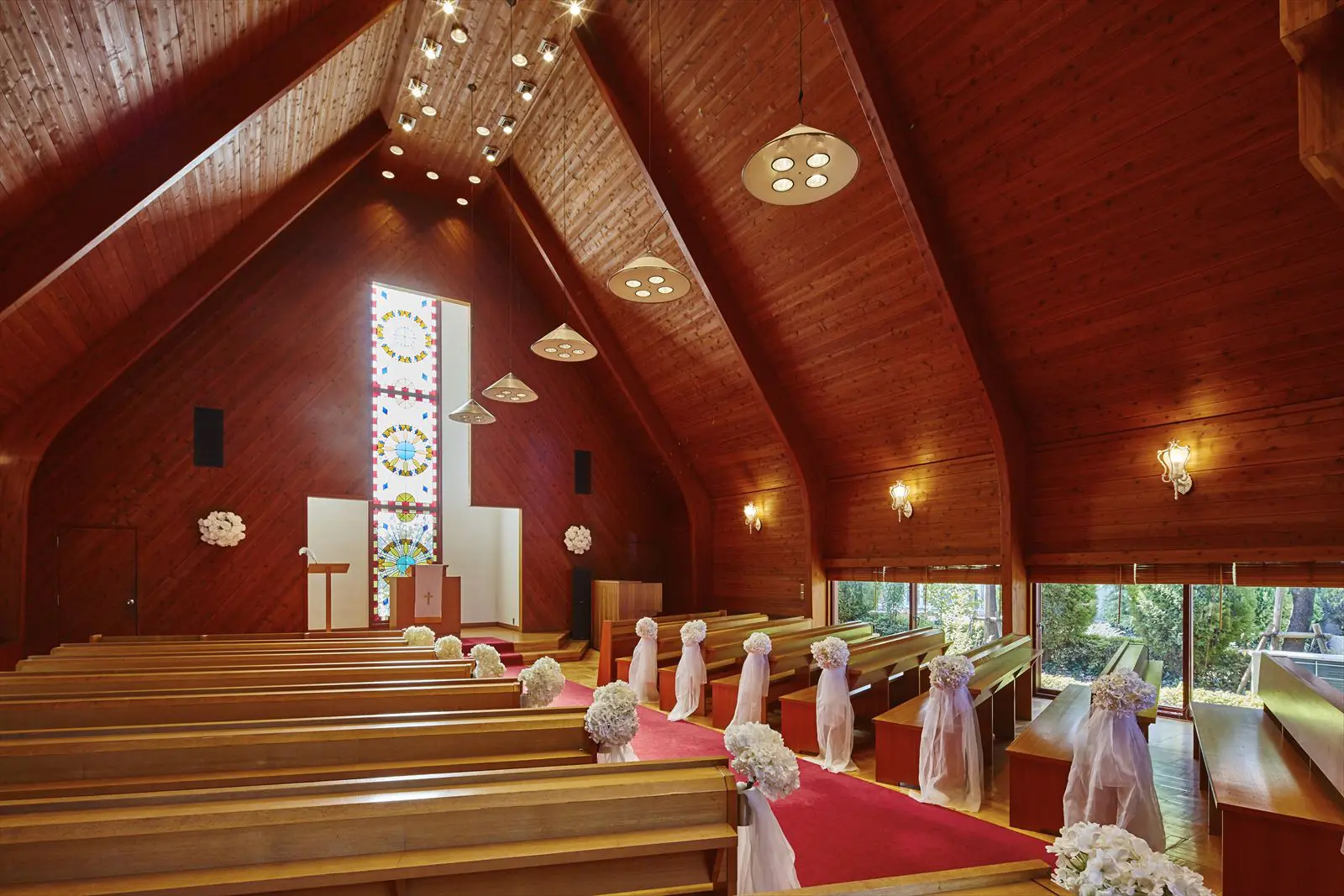 大宮駅より車で約5分。2300平米もの敷地をもつ静かなガーデン内に位置する「ēglise de 葉山庵(エグリーズ ドゥ ハヤマアン)」。エグリーズとは“教会”という意味で、敷地内にある独立型の木造チャペルでのウェデングセレモニーが可能。ガラス張りのバンケットの外には季節を感じさせる自然豊かな中庭が広がり、まるで森の中のガーデンレストランのよう。おもてなしメニューは地元埼玉の農家など生産者にもこだわった食材を用いたナチュラルフレンチ。和食やイタリアンの技法も用い、日本人の好みに合わせた味つけに。