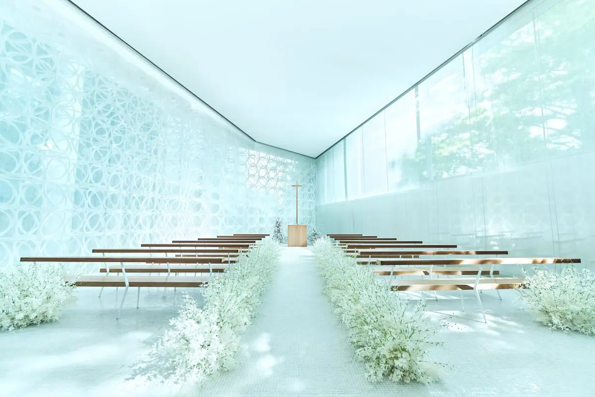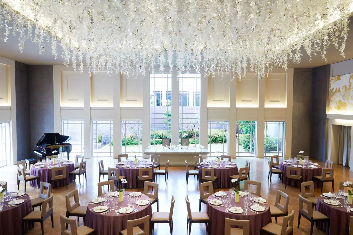 左には永遠を意味するエタニティリング、右には美しい緑が広がる左右非対称のデザイン。最大100名の着席が可能。