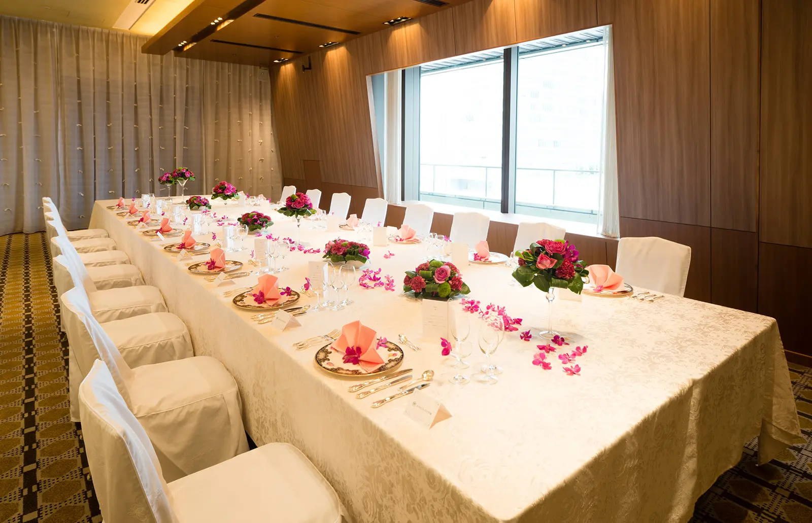 JR大阪駅構内にあり、好アクセスの都市型ホテル「ホテルグランヴィア大阪」。パーティ会場はすべて20階にあり、高層階からの大阪市内の眺望はおもてなしウェディングにぴったり。なかでもパーティ会場「クリスタルルーム」は、“モダンで上品な空間”をコンセプトにした落ち着いた空間。ダークブラウンを基調とした内装は、細かなビーズ玉が織り込まれた気品のある壁紙を使用するなど格式高い雰囲気に包まれ、特別な日にふさわしい舞台。旬の食材を使用した極上の料理と高層階からの眺望を楽しみながら、ゲストと寛ぎのひと時を。