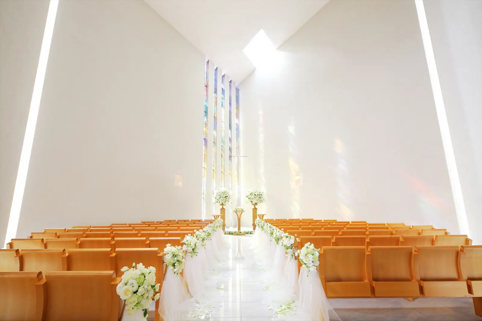 JR大阪駅より徒歩2分、西梅田駅には地下で直結の好立地。駅直結で雨の日も楽に移動ができる「ヒルトン大阪」。祝福を意味する5つのモチーフが描かれたステンドグラスが印象的なアクア・ゴールドチャペルは、天窓から自然光が降り注ぐ開放的な空間。真っ白なバージンロードにステンドグラスの光が映し出されて幻想的なセレモニーが実現。挙式後は、世界のヒルトンブランドならではの気品漂う空間でおもてなしのパーティを。料理人の思いが込められた料理の数々にゲストも大満足。