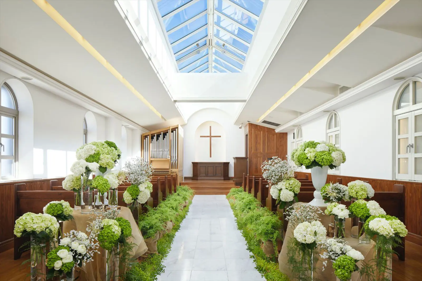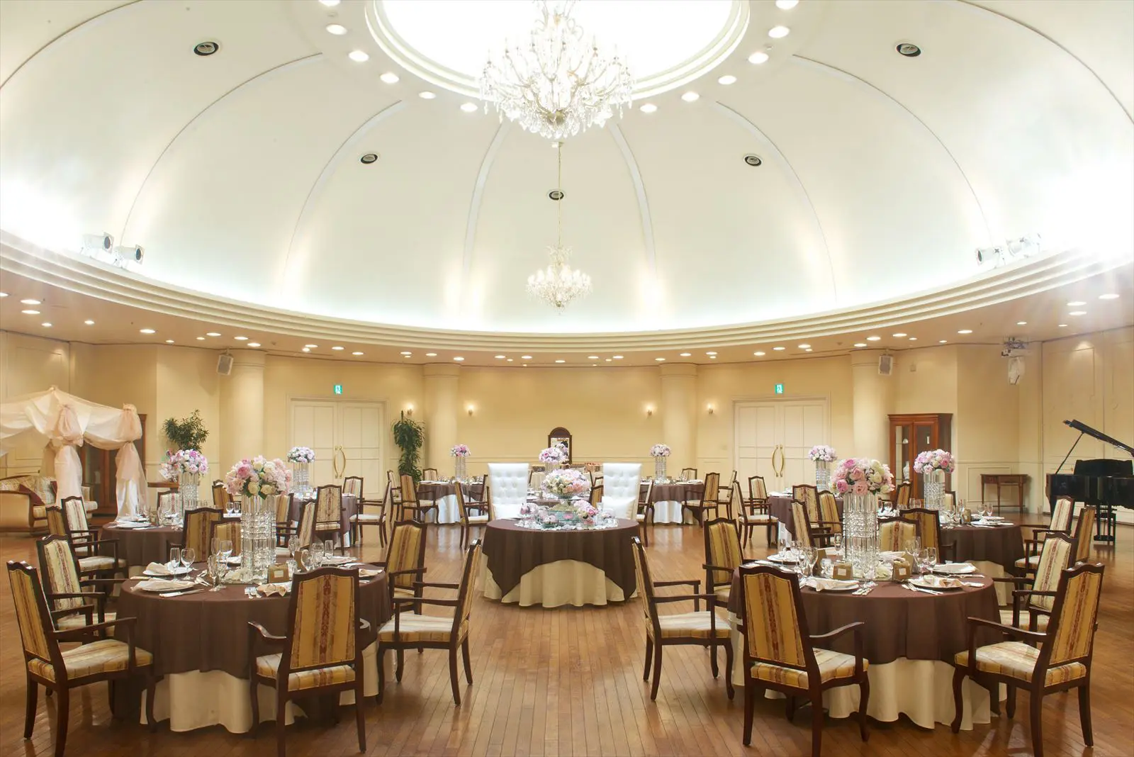 久留米駅より車で5分、西鉄久留米駅より車で7分。福岡市内からのアクセスも便利な「ホテルマリターレ創世久留米」。曲水や橋が配された風情ある日本庭園が広がっており、フォトジェニックと評判。伊勢神宮の「天照大御神」をご招神したモダンな神殿、ホテル最上階に位置する天窓から光が差し込むチャペル、地中海風のタイルを敷き詰めた開放的なガーデンなど様々な挙式スポットがあり、ふたりのスタイルに合わせて自在に選ぶことが可能。ヨーロッパ貴族の邸宅のような「グランデピアッツア」をはじめ、バンケットも多彩。