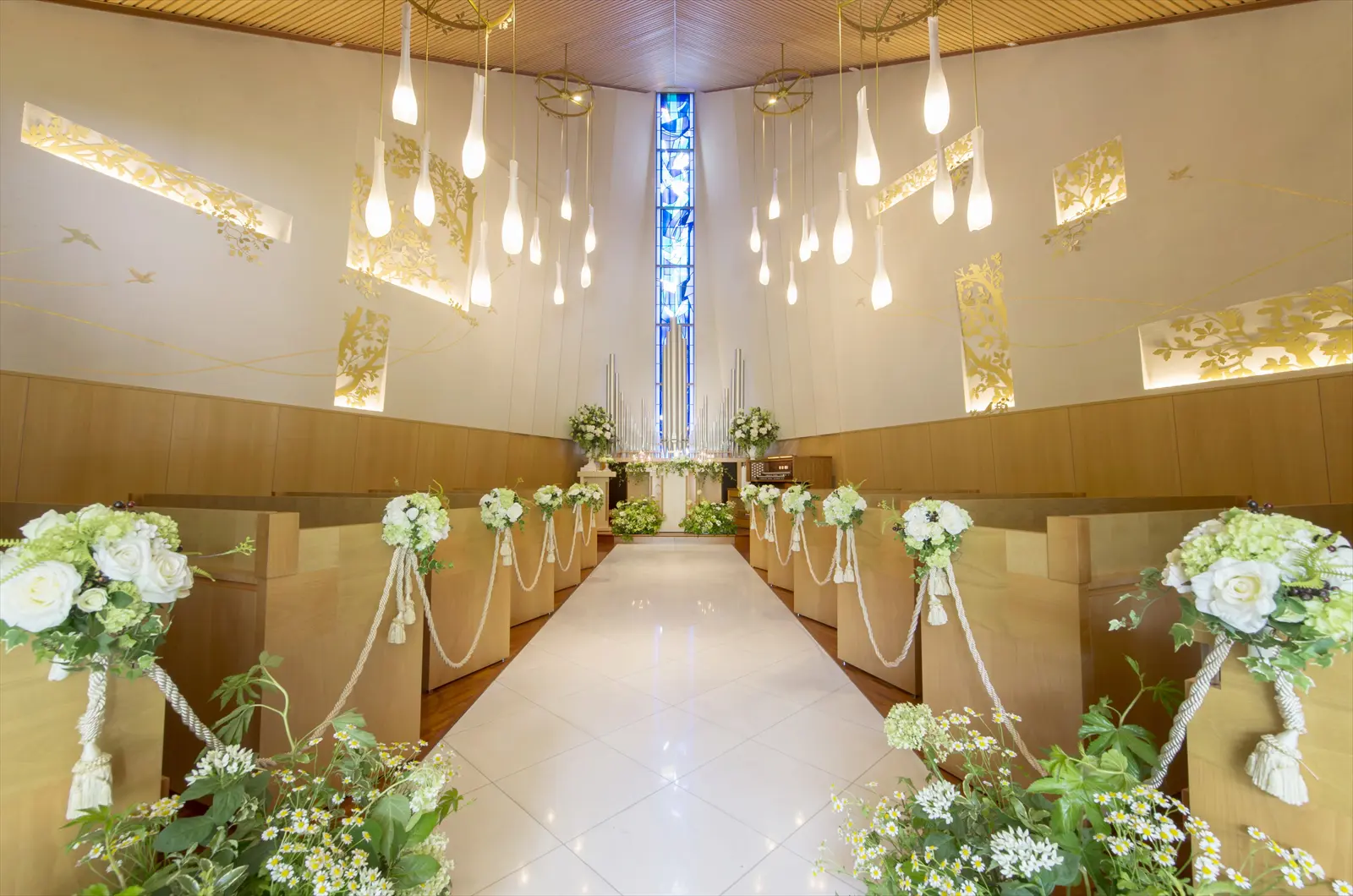 ウッディタウン中央駅より徒歩1分。大阪や三ノ宮からもアクセス便利な「ザ・セレクトンプレミア 神戸三田ホテル」。花嫁の純潔を表す白いバラのアーチをくぐり抜けて辿り着く独立型チャペルは、ブルーのステンドグラスが見守る静寂に包まれた空間。キャンドルの灯りに包まれて、バージンロードを歩く姿はゲストの心に深く刻まれて。挙式後は、四季を通して様々な表情を見せるイングリッシュガーデンでアフターセレモニーを。パーティは壁一面の窓からふんだんに自然光が差し込む「星」、天井が高くラグジュアリーな「花」からセレクトが可能。