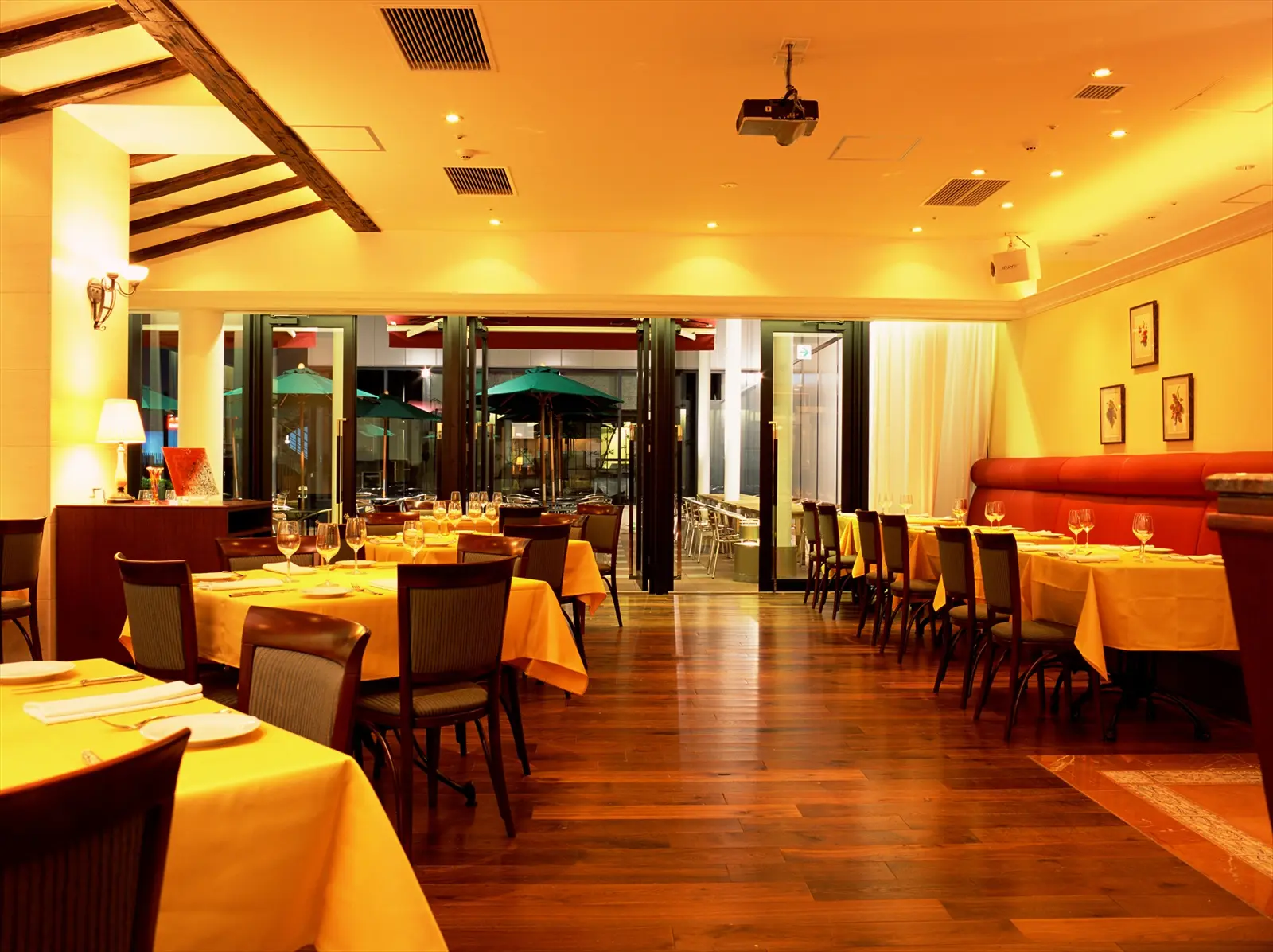 大阪梅田駅より徒歩1分、大阪駅からも徒歩5分という好立地の「La Bilancia Umeda」。イタリアンレッドで統一されたソファ席のあるダイニングは120人の着席が可能な広々とした空間。オープンキッチンから運ばれる出来たての本格イタリアンはゲストへの何よりのおもてなしに。開放的なテラスからは茶屋町の夜景が楽しめる。