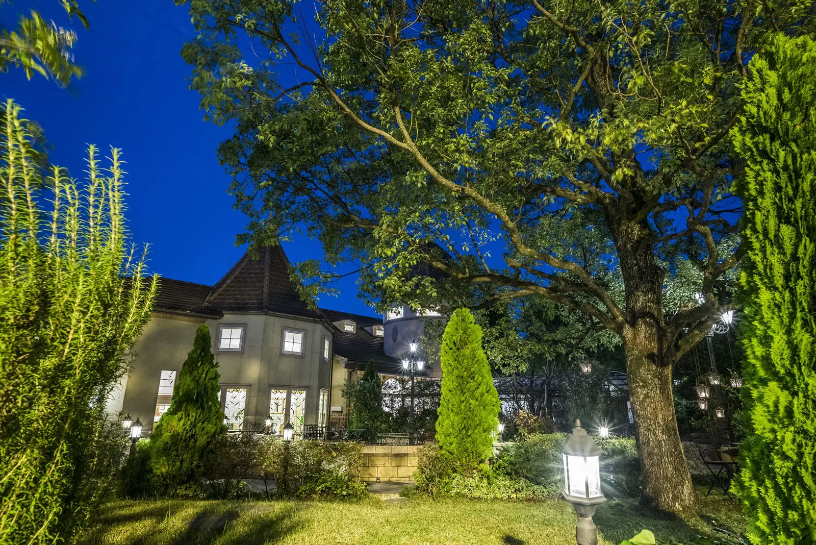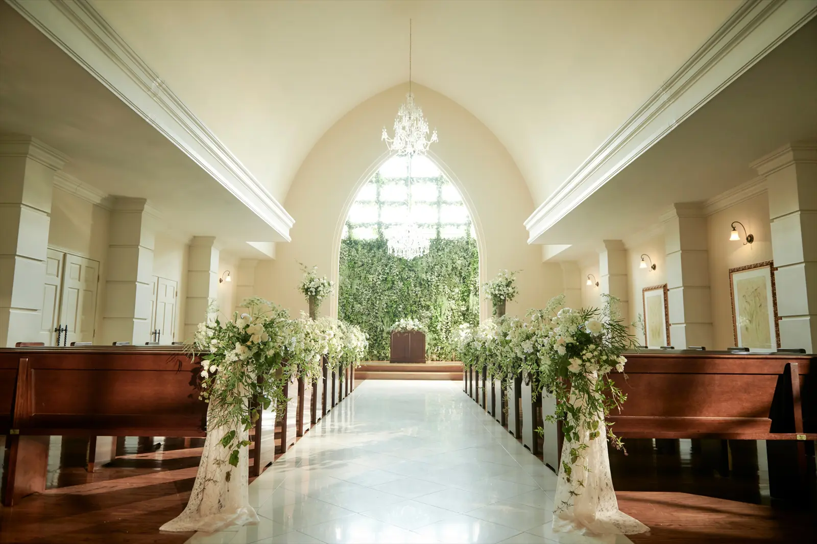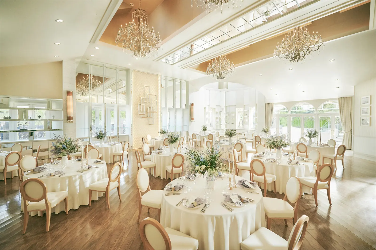 穂積駅より車で10分、岐阜駅より車で15分。緑に溢れた2000坪もの敷地が広がる「le chant de Coucou(ル・シャン・ド・クク)」。外国映画に出てくるような壮麗な邸宅をふたりとゲストで貸し切って記憶に残る一日を過ごすことができる。天井高10mのチャペルはバージンロードの長さが14mもあり、ゆったりとした広さ。祭壇の前にある鮮やかなグリーンウォールがセレモニーを美しく彩っている。大きな窓から明るい光が差し込むバンケットにはプライベートガーデンが付いており、シェフズダイニングやデザートビュッフェなど多彩な演出を楽しむことが。