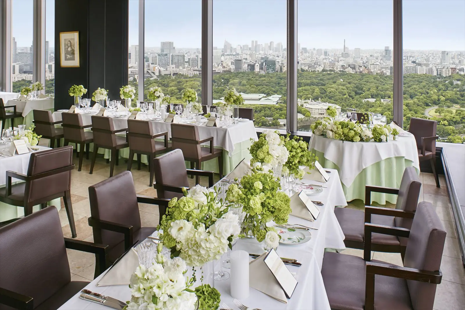 JR「東京駅」丸の内南口より徒歩1分、丸ノ内線「東京駅」・千代田線「二重橋前〈丸の内〉駅」直結。抜群のアクセスを誇る丸の内ビルディング、通称“丸ビル”内にある「MONNALISA 丸の内店」。国内外の名店で研鑽を重ねたフレンチの巨匠、河野透氏がオーナーシェフを務めるフレンチレストランで、素材にこだわった味わい深いひと皿は、芸術のような美しさ。白を基調とした空間は美術館をイメージしており、壁面に飾られた絵画が趣をプラス。壁一面がガラス張りになっており、丸ビル最上階36階から臨む、首都・東京の景色は圧巻。