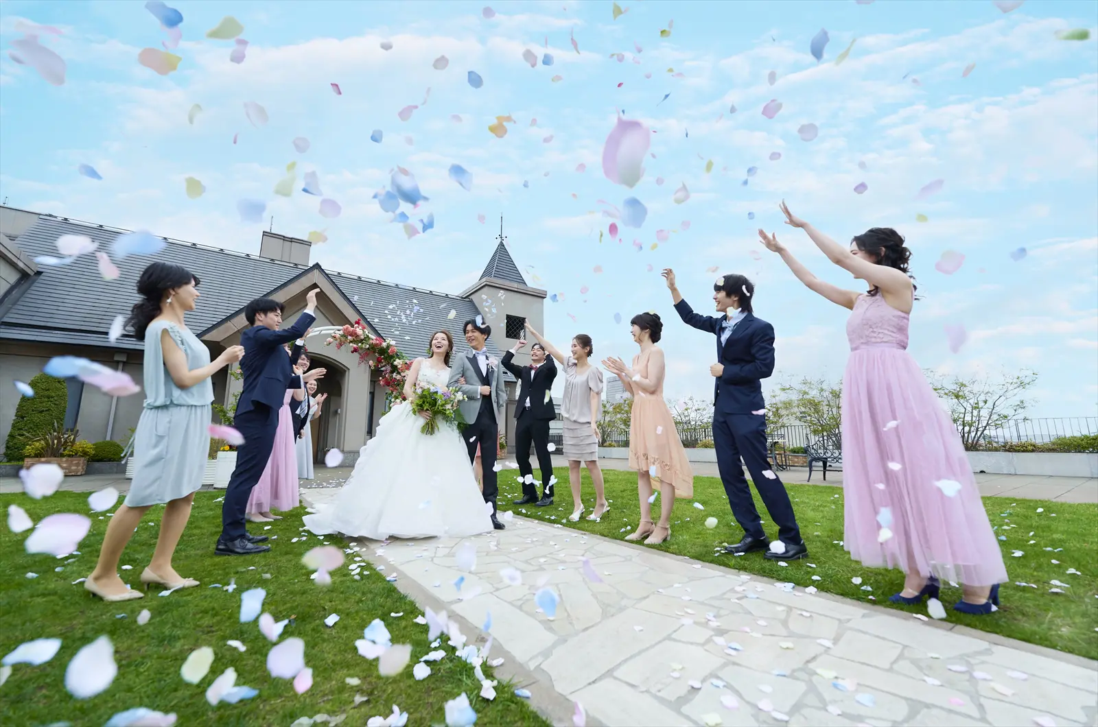 チャペルに隣接した開放感満点のガーデンは、空と緑と色とりどりの花々に囲まれたプライベート空間。ゲストの歓声と祝福に包まれて、笑顔のアフターセレモニーを。200 坪もの広大なガーデンだから、大人数でもゆとりを持って実施できる。