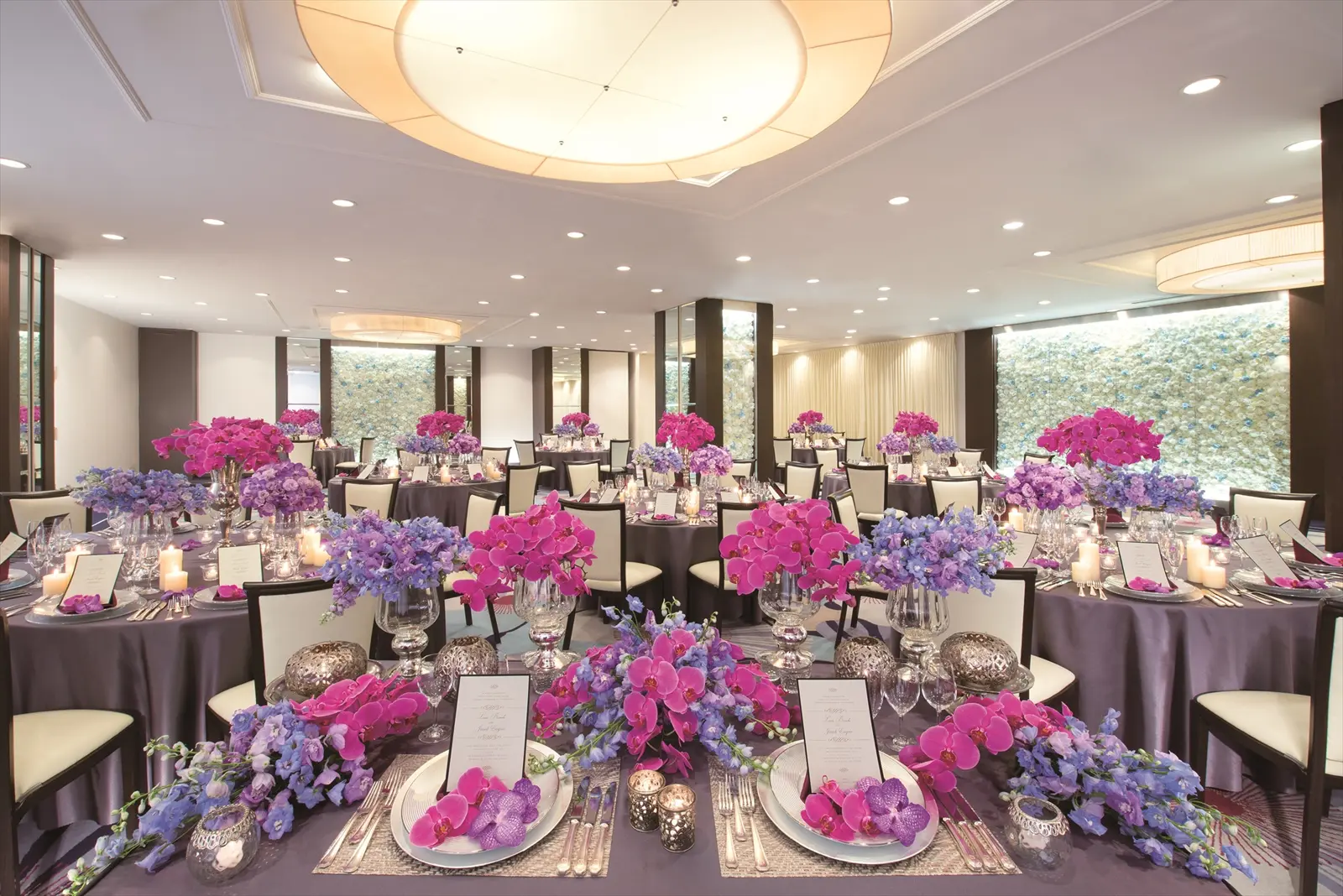 ブルー&ホワイトのローズが壁一面に敷き詰められたパーティ会場「ローズ」。上品で優しい時間の流れと心からのおもてなしが、ゲストの心に深く思い出を刻む。どんなドレスでも映える会場は花嫁を美しく輝かせる。
