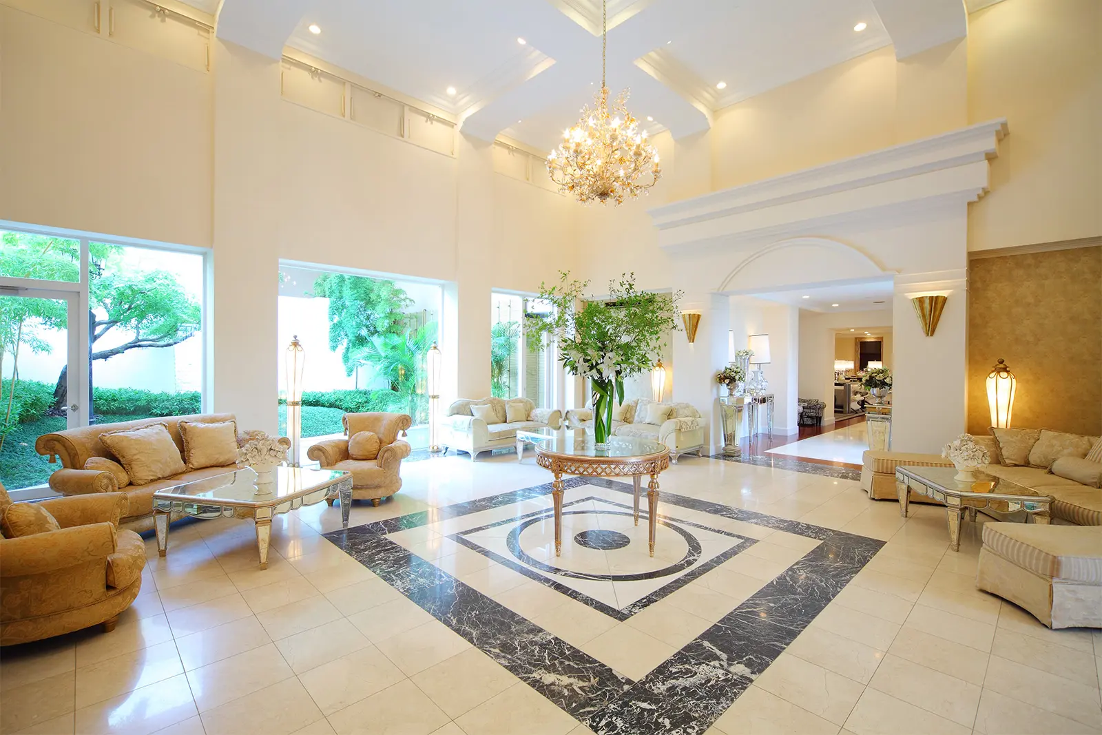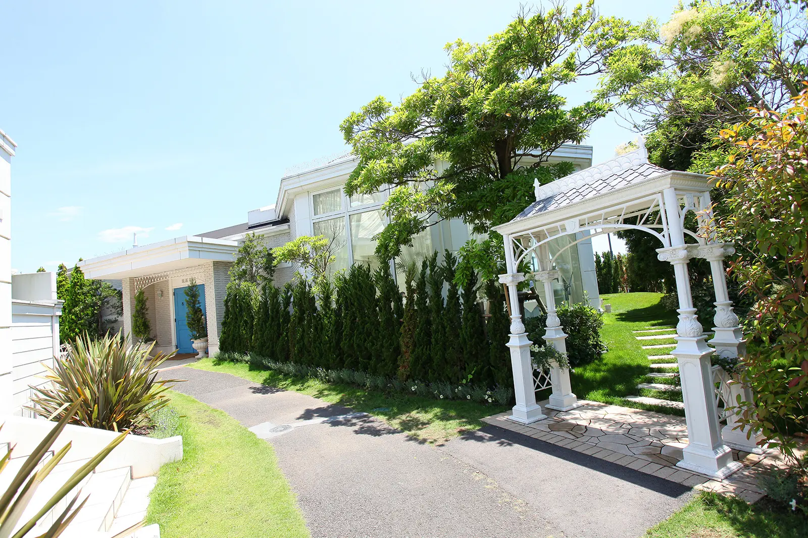 海に面した4300坪もの広大なリゾート空間「アートグレイス・ウエディングコースト」。ロビーへと一歩足を踏み入れると、そこには気品溢れる空間と贅沢な調度品の数々がお出迎え。目の前に真っ青な空と海の大パノラマが広がる3面ガラス張りのチャペル「天空のチャペル」は、祭壇に立つとまるで空に浮かんでいるかのよう。ふんだんに差し込む自然光が満ちた明るい空間でリゾートウェディングのような挙式を。ガーデン付きの6つの邸宅では、オープンキッチンから運ばれる出来たての料理でゲストへのおもてなしが叶う。