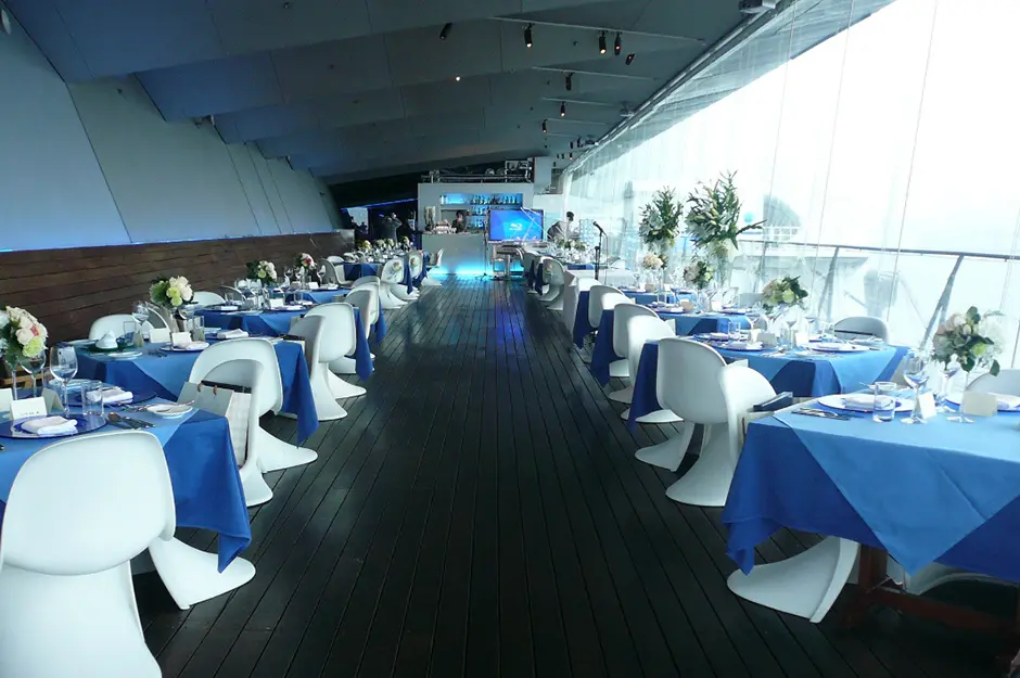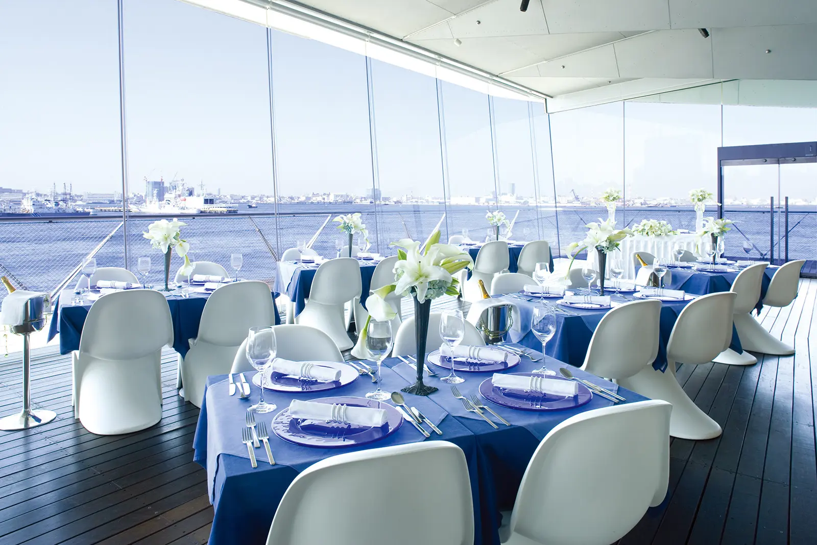 横浜港の大さん橋にあるサブゼロは洗練された大人の魅力にあふれるレストラン。船上ウェディングを思わせる挙式は、目前にみなとみらいの絶景が広がり、港を散策する人々もからのサプライズな祝福も。ダイニングは全長40m全面ガラス張りで圧巻の眺望を楽しみながらのウェディングパーティが叶う。スタイリッシュなバーカウンターではオリジナルカクテルでもてなしたり、段差のないバリアフリー設計もうれしい。